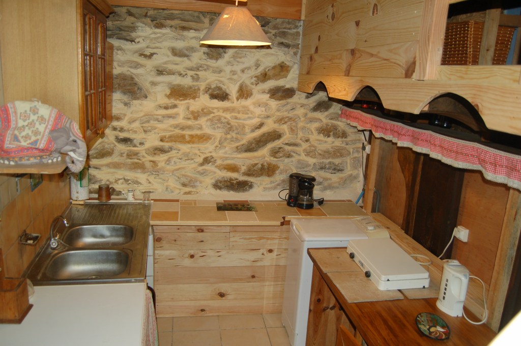 Le coin cuisine en rez-de-chaussée est équipé d’un évier, d’un frigo, d’un réchaud , d’une bouilloire électrique, d’une cafetière et des ustensiles de cuisine.